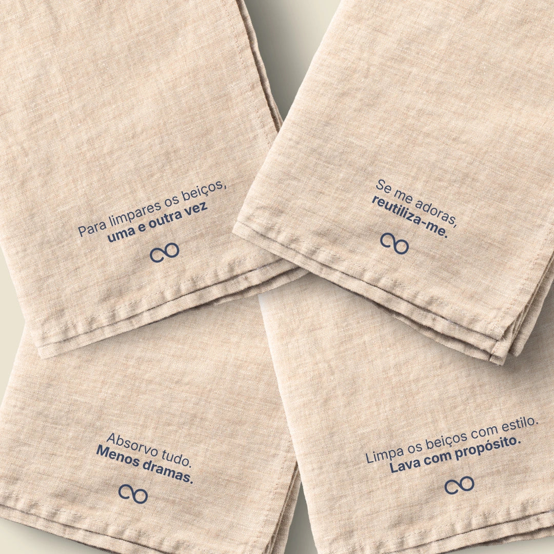 Os guardanapos reutilizáveis, feitos em algodão 100% fairtrade, foram pensados para acompanhar momentos reais: jantares em família, brunches demorados, pão com manteiga às pressas e gargalhadas inesperadas.